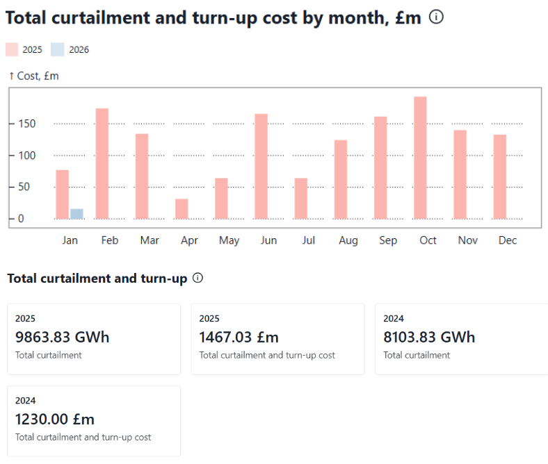In 2025 the UK spent nearly £1.5 billion in curtailment and turn up costs for wind power generation - that is, money paid ultimately by the consumer for wind farms to stop producing power (curtailment) and for gas or other electricity providers to step in (turn up), due to electricity grid constraints.
