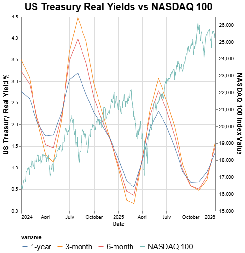 It is interesting to note that in the most recent market high was reached in October 2025 and that real interest rates have been climbing steadily since then. There was a small (but still significant) ~8% correction in the NASDAQ100 around then.