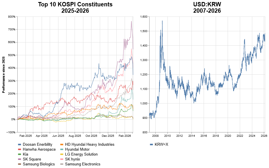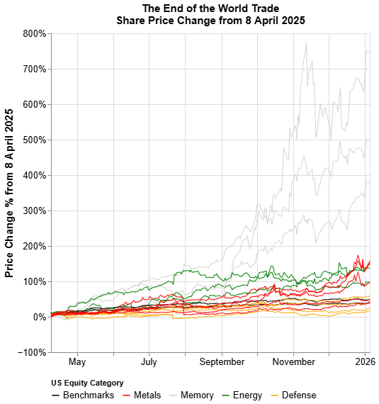 This would likely be very negative for energy prices, positive for equity markets overall, and negative for a handful of recent darling sectors - defense, rare earths, and precious metals. This latter effect would be channeled through a reduction in tensions between the US and China, as Iran supplies a significant amount of China’s oil imports. This could potentially be negative for US and South Korean memory stocks as well, if part of what has been driving them recently has been stockpiling in case of trade disruptions.