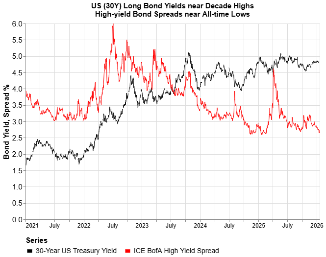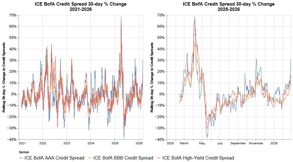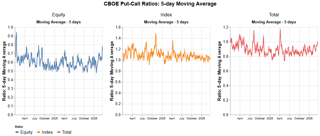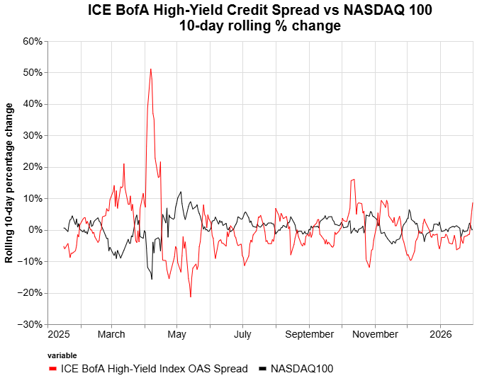 Finally, we saw that the ICE BofA High Yield Option Adjusted Credit Spread spiked again last week. In the past significant spikes have been accompanied with market volatility. The 10-day change is the highest since November when the NASDAQ 100 saw a slight correction. But this spike could have been Friday’s metals panic and might not have broader market implications. The rest of this week might give us a clearer signal but on the whole we’re positioned for some downside here.