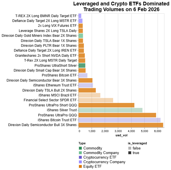 Leveraged and Crypto ETFs1,2 Dominated Trading Volumes Today - 6 Feb 2026