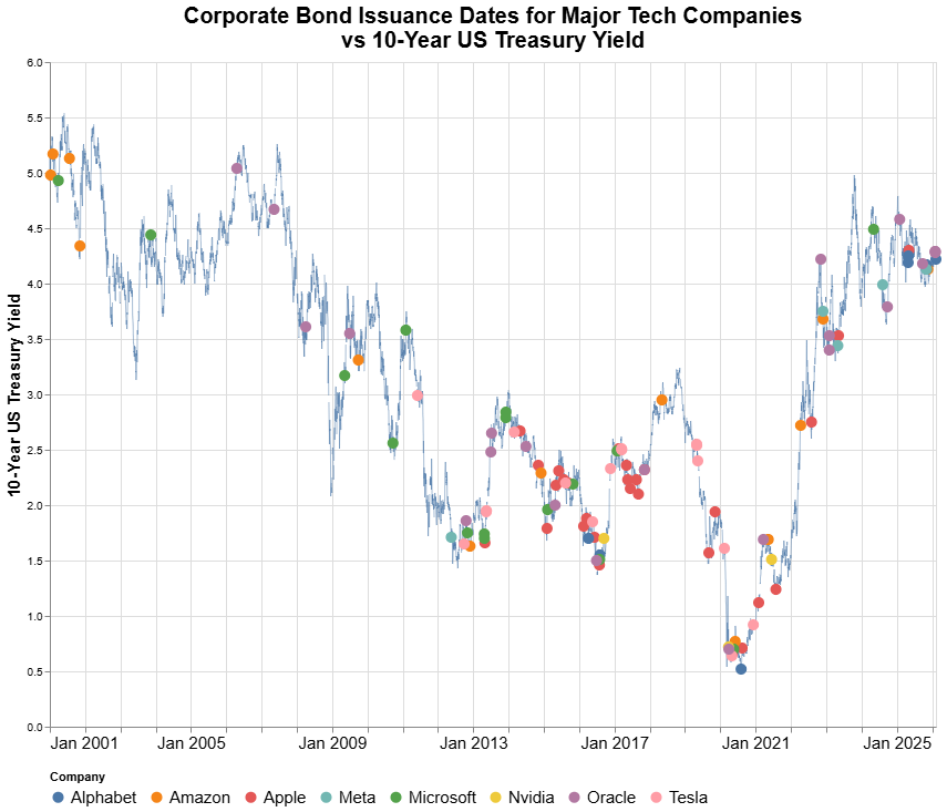 The main one would be if interest rates went up - either for these companies specifically, or for borrowers more broadly. But interest rates are not low right now. Indeed the 10-year yield is only about 80bps from its 15-year peak reached at the start of 2025. Which means that either these companies are not really sensitive to borrowing costs, or they are sufficiently strapped for cash that they need the financing now, or they expect interest rates to be higher a few months or years from now.
