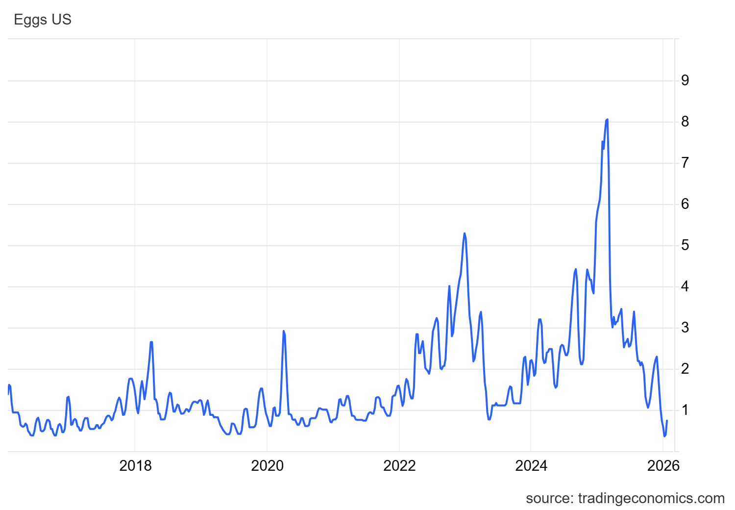 We recently talked about egg prices in the US likely hitting a bottom, and on that basis looked into Vital Farms and Cal-Maine Foods. Well either there’s a glitch on the website or eggs in the US just dropped 95% to $0.06 per dozen. Most recent USDA data is still pointing at $1.05 and perhaps it has to do with the US government shutdown. Otherwise, something fishy is going on with eggs.