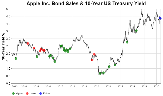 The dots show Apple bond issues since 2013. Green dots (successful guess) are instances where the 10-year yield was
