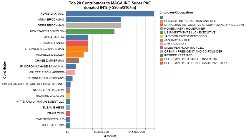 We note that the largest single contribution came from FORIS DAX INC the parent company of the Crypto.com exchange. Fairshake, a crypto-focused PAC, raised several hundred million dollars during President Trump’s previous election cycle. The largest joint contribution, if taken together, came from OpenAI CEO President and Co-Founder Greg Brockman and his wife Anna Brockman. In the healthcare space, Nosheen Hashemi of January AI donated $ 1m as did Benjamin Landa of Sentosa Care.