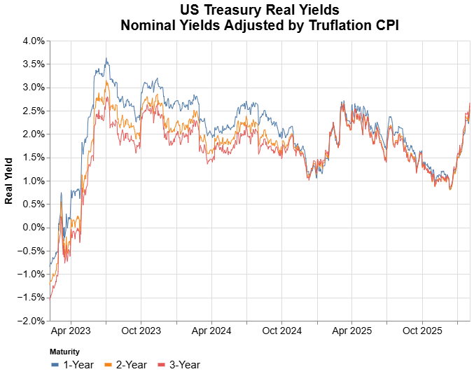 Official US CPI data suggests that the US inflation rate is around 2.7% per year. Truflation data suggests otherwise and using US treasuries to calculate real yields for relatively short tenors (1-3 years) shows that real yields have increased to their highest levels since April 2025.
