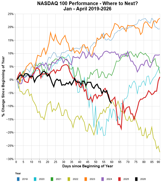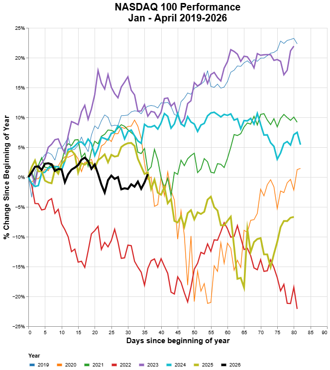 It is interesting to note that in the most recent market high was reached in October 2025 and that real interest rates have been climbing steadily since then. There was a small (but still significant) ~8% correction in the NASDAQ100 around then.