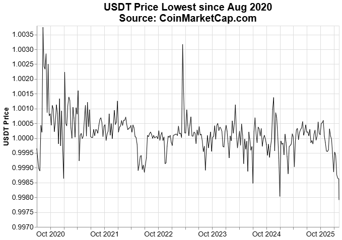 Secondly, as cryptocurrency value more broadly declines, the demand for stablecoins like USDT or USDC may decline as well, and they may face redemptions. These redemptions would likely require selling off the assets held as collateral to maintain the 1:1 peg that these two stablecoins have with the US dollar, potentially also furthering a selloff. Given that stablecoin providers are collectively one of the largest holders of short-term US Treasury debt, and they may choose to sell off these “safest” of assets first (especially if the remainder of their portfolio were in a drawdown/showing an unrealised loss), which would put upward pressure on short-term interest rates (and potentially longer term ones as well). Indeed one can see a hint of this already - USDT is currently showing the largest deviation from its $1 peg since the Covid-19 market turmoil in March 2020, already exceeding the April 2025 drawdown. Granted, the deviation is tiny. But relative to recent history, it is significant.